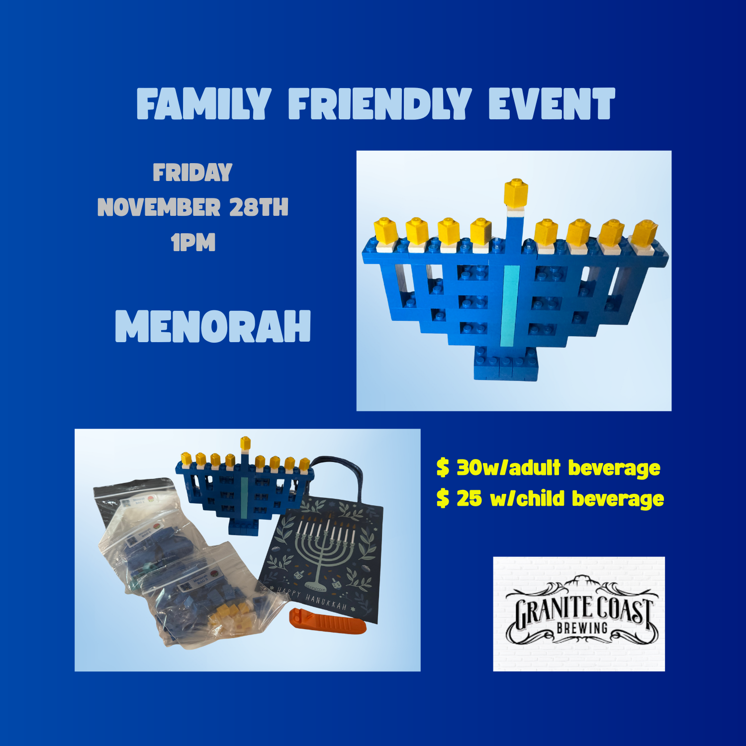 Hanukkah Categories: Select a Category Hanukkah RiverWalk Brewing Ornaments Christmas Motorcycle Anthem Ride CPFProductions Fundraiser Harley Davidson Wednesday Addams Wicked™️ Halloween Family Friendly Retro Gift Card Marvel Harry Potter Wicked Axe Granite Coast event Hanukkah Quick View 11/28/2025 - Granite Coast Brewing Company - Family Friendly Polar Bears, Menorah & Nutcracker from $25.00 View Options Have Questions?danielle@dkdsipandbuild.com